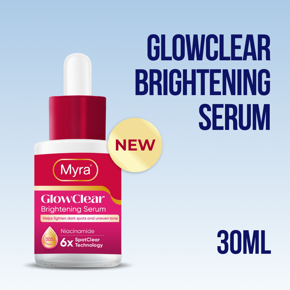 Myra GlowClear Brightening Serum is formulated with 6x SpotClear Technology, an enriched brightening technology that helps lighten dark spots and skin discoloration for a flawless-looking, even-toned glow.