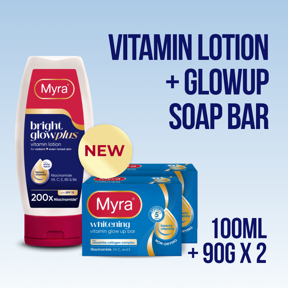 NEW MYRA BRIGHTGLOW PLUS VITAMIN LOTION 100ML + MYRA WHITENING VITAMIN GLOWUP SOAP BAR 90G (BUNDLE OF 2)